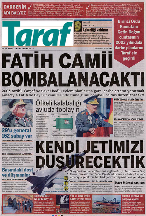AK Parti'nin 2002'de tek başına iktidar olmasından hemen sonra başlatılan darbe girişiminin 5000 sayfayı bulan belgesi Taraf Gazetesi'nde yayınlanmaya başladı. 29'u general 162 subayın katıldığı bir toplantıda kararlaştırıldığı ileri sürülen darbe planı 12 Eylül'ü model alırken, 2003 darbesinin Balyoz olarak isimlendirilmiş. Çarşaf ve Sakal gibi isimleri olan eylem planları, camilerde kaos yaşatmayı hedeflerken, Hava Kuvvetleri'ne ait jetin Yunanistan açıklarında düşürülmesiyle AK Parti hükümetinin dış politikada aciz olduğu havası estirilecekmiş. Planda, darbeden sonra işbirliği yapılacak 137 gazetecinin ve tutuklanacak 36 gazetecinin isimleri bile belirlenmiş.