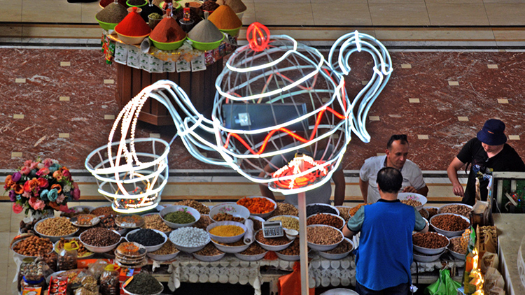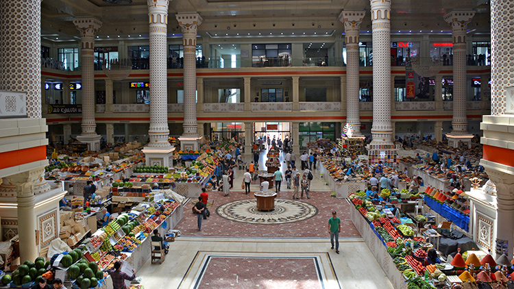 Tacikistan'ın başkenti Duşanbe'deki Mehrgon Pazarı, satılan yüzlerce çeşit ürünün yanı sıra mimarisi ile de ziyaretçilerini kendine hayran bırakıyor.