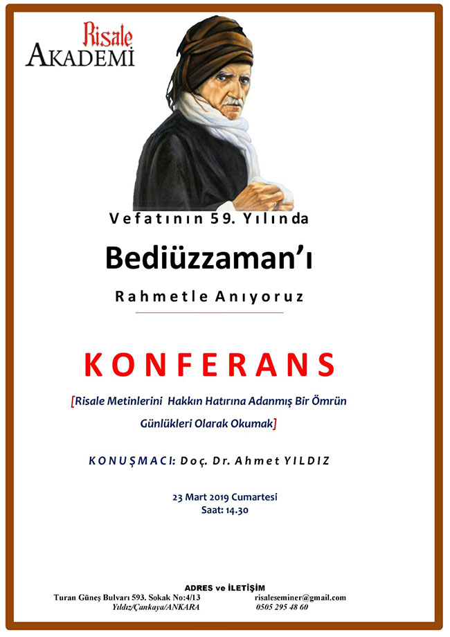Bediüzzaman Said Nursi Hazretleri'nin 59. vefat yıldönümü nedeniyle Risale Akademi'de anma programı düzenlenecek.