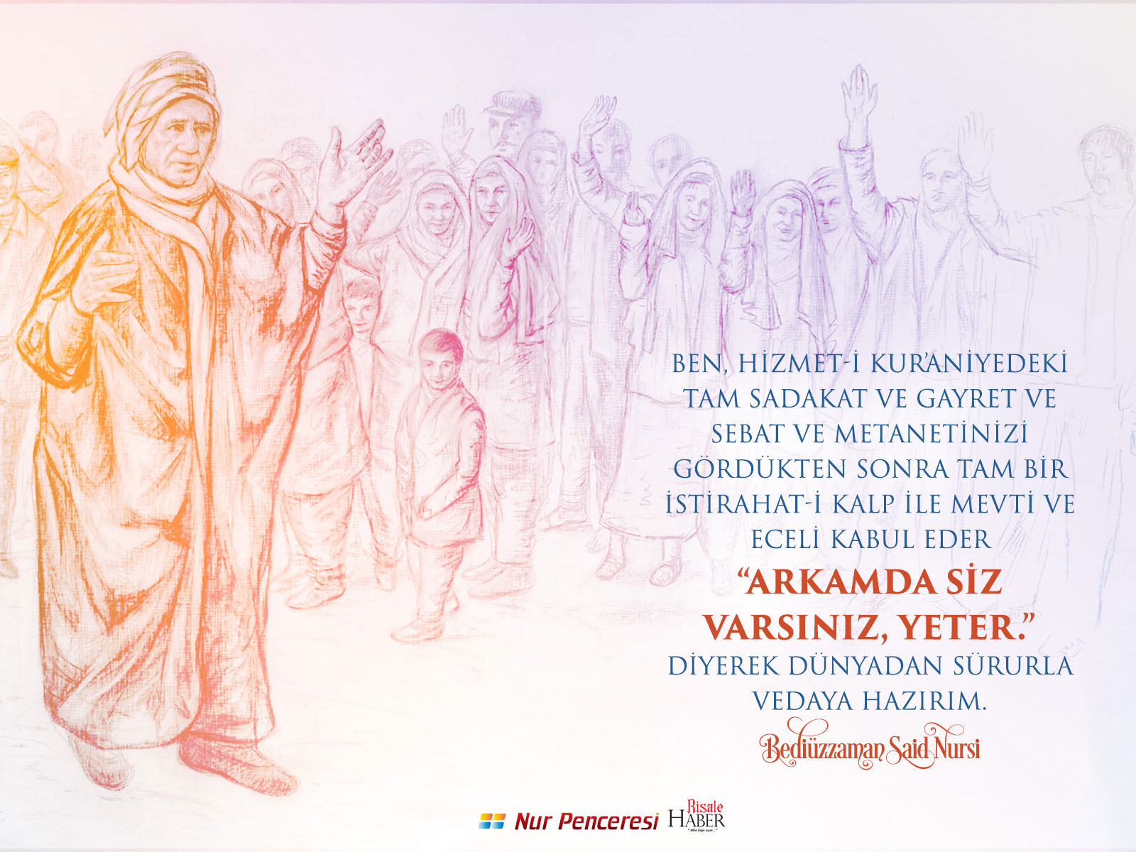 Ben, hizmet-i Kur'âniyedeki tam sadakat ve gayret ve sebat ve metanetinizi gördükten sonra tam bir istirahat-i kalble mevti ve eceli kabul eder, arkamda siz varsınız yeter diyerek dünyadan sürurla vedaya hazırım. (Bediüzzaman Said Nursi)