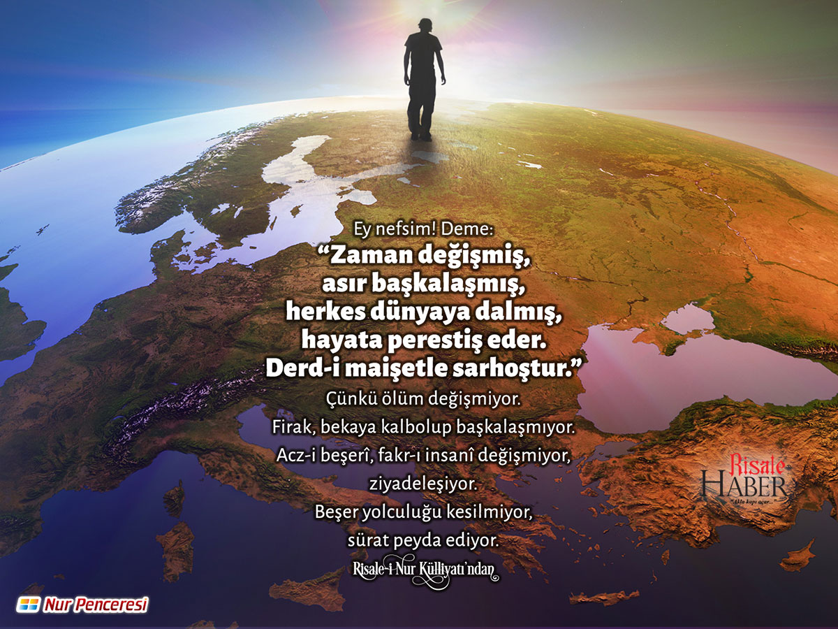 Ey nefsim! Deme, "Zaman değişmiş, asır başkalaşmış. Herkes dünyaya dalmış, hayata perestiş eder, derd-i maişetle sarhoştur." Çünkü ölüm değişmiyor. Firak, bekàya kalb olup başkalaşmıyor. Acz-i beşerî, fakr-ı insanî değişmiyor, ziyadeleşiyor. Beşer yolculuğu kesilmiyor, sür'at peydâ ediyor. (Bediüzzaman)