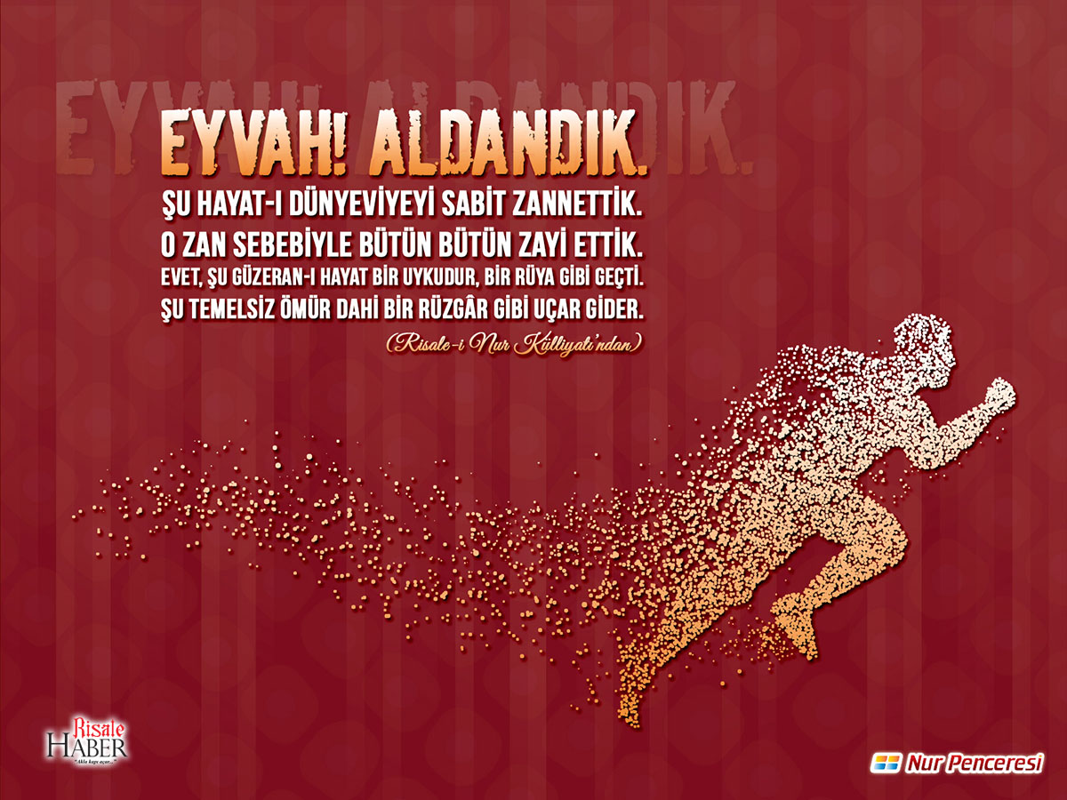 Eyvah, aldandık! Şu hayat-ı dünyeviyeyi sabit zannettik. O zan sebebiyle bütün bütün zayi ettik. Evet, şu güzerân-ı hayat bir uykudur; bir rüya gibi geçti. Şu temelsiz ömür dahi bir rüzgâr gibi uçar, gider. (Bediüzzaman Said Nursi)