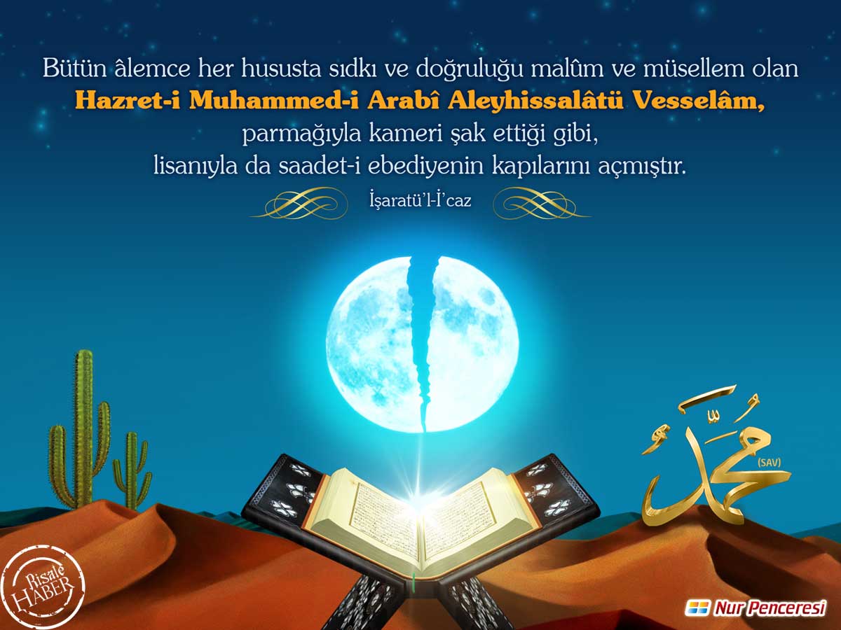 Bütün âlemce her hususta sıdkı ve doğruluğu malûm ve müsellem olan Hazret-i Muhammed-i Arabî Aleyhissalâtü Vesselâm, parmağıyla kameri şak ettiği gibi, lisanıyla da saadet-i ebediyenin kapılarını açmıştır.