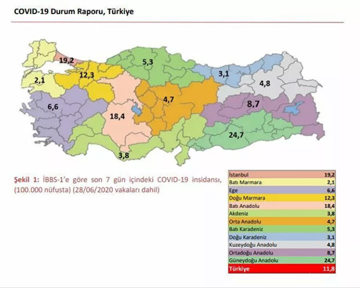 Türkçe ve İngilizce yayımlanan 'Türkiye Kovid-19 Durum Raporu', 30 Haziran tarihini taşıyor ve rapordaki veriler 28 Haziran itibariyle elde edilen istatistikleri içeriyor.