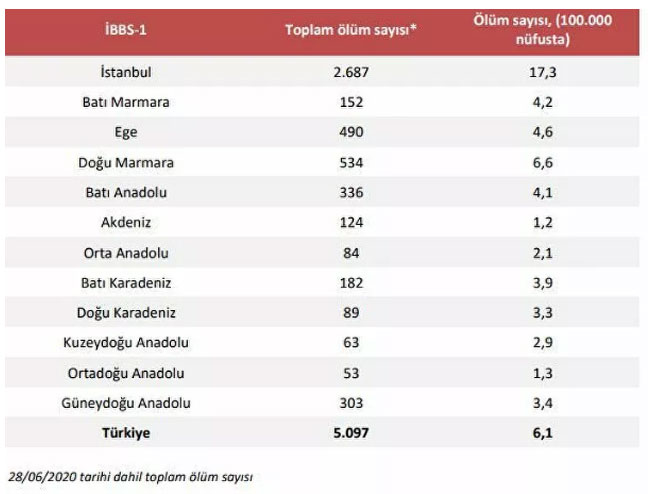 Ölüm oranları istatistiklerinde yine İstanbul'un ilk sırada olduğu dikkat çekiyor. İstanbul'u ise Ege bölgesi takip ediyor.