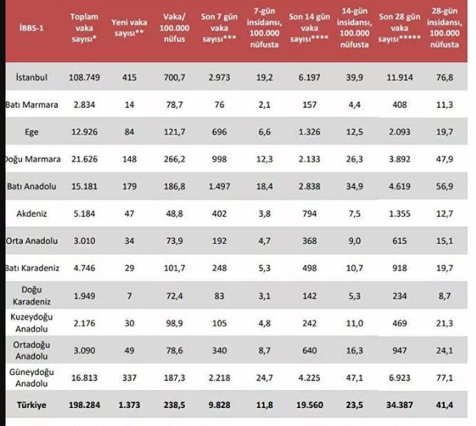 "Türkiye’de ilk koronavirüs vakasının bildirildiği 11 Mart 2020 tarihinden itibaren laboratuvar tarafından onaylanmış toplam 198.284 vaka Sağlık Bakanlığına bildirilmiştir. 100.000 kişiye düşen toplam vaka sayısı son 7 günde 11,8, son 14 günde 23,5 ve son 28 günde 41,4 olarak gerçekleşmiştir" ifadelerine yer verilen rapora göre, en çok vaka sayısı ise 108.749 ile İstanbul'da.
