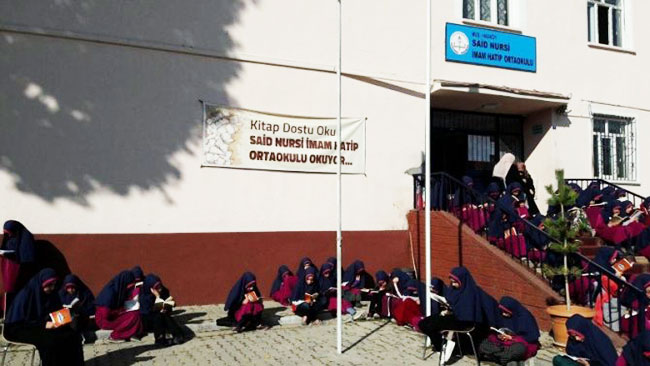 Hasköy'de Said Nursi İmam Hatip Ortaokulu'nda eğitim gören öğrencilerin tamamı okul bahçesinde kitap okuma etkinliğine katıldı. Said Nursi İmam Hatip Ortaokulu idarecileri tarafından "Farkımız Okumak Olsun" projesinin devamı olarak sunulan "Kitap Dostu Okulun Kitap Sandığı" projesiyle öğrenciler okumaya devam ediyor.