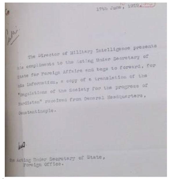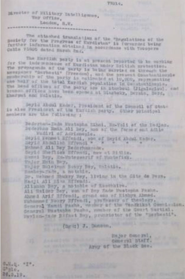 Askeri gemi telgrafından 2 Mart tarihinde alınan Kürdistan Terakki Cemiyeti Yönetmeliği, ek bilgi olarak ilişikte sunulur. Kürt Partisinin (cemiyetten söz ediliyor) şu an için Britanya mandasında bağımsız bir Kürdistan için çalıştığı rapor edilmektedir.