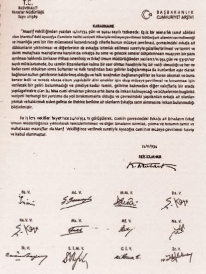 (İhtilaflı kararname Bu vakfiyenin yazılması ve okunmasından tam 471 sene sonra Türkiye Cumhuriyeti Bakanlar Kurulu, Ayasofya için özel bir karar aldı. 24 Kasım 1934 tarihli ve 2/1589 sayılı bu kararla Ayasofya Camii resmen müze haline getirildi.)