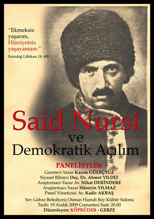Gebze Belediyesi Kültür Merkezi Tiyatro salonunda 19.12.2009 Cumartesi günü saat 20.00’de 'Said Nursi ve Demokratik Açılım' konulu bir panel düzenleniyor