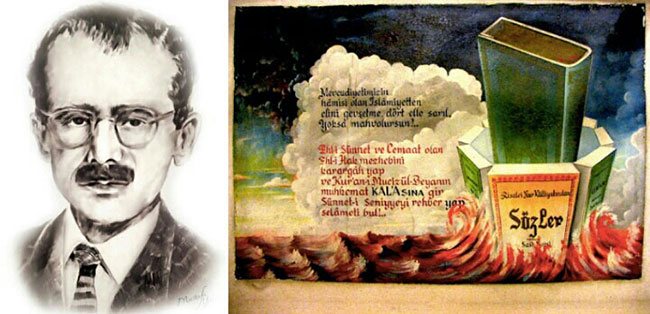 Duvarı tuval yaptık, yağlı boya olarak bugün mevcut olan, görmediyseniz gidip İstanbul’da görün… O istek üzerine bir tablo yaptık, fırtınalı bir denizde Risale-i Nur Kur’ân-ı Azimüşşan’ı çevrelemiş, koruyor. Denizin fırtınasından koruyor… Resmini oraya çizdim.