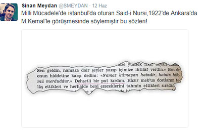 Ulusalcı yazar Sinan Meydan, Said Nursi ile M. Kemal Atatürk arasında TBMM'de yaşanan namaz tartışmasını gündeme getirdi. Meydan, Twitter hesabından Emirdağ Lahikası'nda geçen şu bölümü paylaştı: "Hem Ankara’da, divan-ı riyasetinde pek çok meb’uslar varken Mustafa Kemal şiddetli bir hiddetle divan-ı riyasetine girip, bana karşı bağırarak: “Seni buraya çağırdık ki, bize yüksek fikir beyan edesin. Sen geldin, namaza dair şeyler yazıp içimize ihtilâf verdin.” Ben de onun hiddetine karşı dedim: “namaz kılmayan haindir, hainin hükmü merduddur.” Dehşetli bir put kırdım."