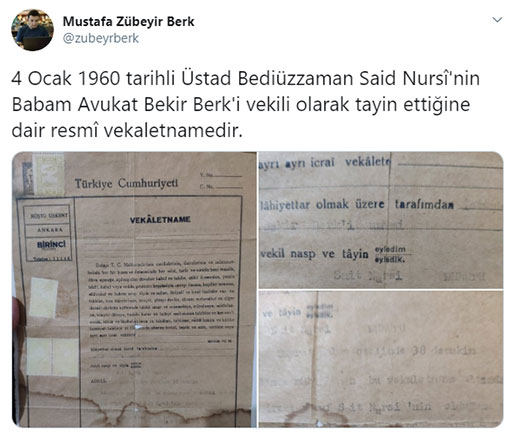 Bediüzzaman Hazretlerinin Bekir Berk'e verdiği vekaletnameyi yayınlayan Zübeyir Berk, "4 Ocak 1960 tarihli Üstad Bediüzzaman Said Nursî'nin Babam Avukat Bekir Berk'i vekili olarak tayin ettiğine dair resmî vekaletnamedir. Bu ara kimileri vekalet yok iddiasında oldukları için paylaştım" dedi.