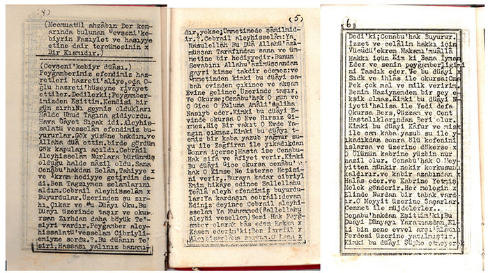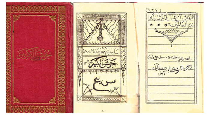 Solda Cevşen'in kapağı. Ortada Cevşen-i Kebir’in ilk sayfası. Sağda, Cevşen duasının son sayfasında Bediüzzaman’ın el yazılarıyla dua... “Yâ Allah! İsm-i A’zam hürmetine, bu nüshayı yazan ve okuyanları sahib-i Cennet eyle... Âmin...” Cevşen’i yazan hattat ağabey belli değil...