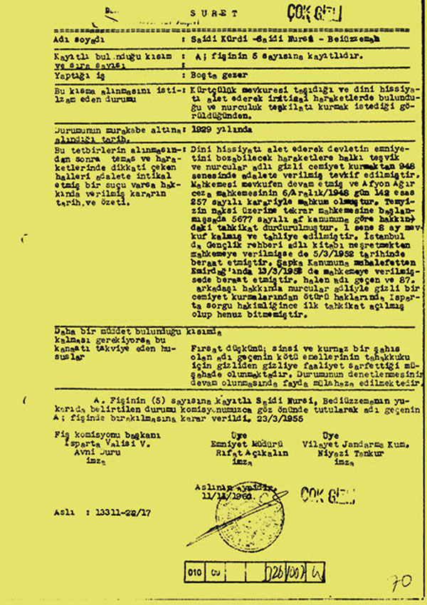 Gürsoy, “Devlet işi gücü bırakmış bir din âlimini takip ediyor. Vali, emniyet müdürü ve jandarma bizzat işin içinde.” diyor Yazar, 1955 tarihli ilk defa yayımlanan belgeye göre Isparta’da vali yardımcısı, jandarma komutanı ve emniyet müdürünün fiş komisyonu olarak toplandığını açıklıyor. Buna göre Said Nursi’nin A fişinde kalmasına karar verilmiş. Bu durumun Demokrat Parti iktidarı zamanında olduğunu hatırlatan Gürsoy, dönemi şu sözlerle anlatıyor: “Said Nursi’nin de desteğiyle DP yeniden iktidar olmuş. Ne beklersiniz? Fiş komisyonu bu belgeleri tozlu raflara koymalı değil mi? Hayır tam tersi, ‘irtica’ kampanyalarının da etkisi ile kitaplar toplatılıyor, baskınlar yapılıyor, mektuplarına el konuyor, seyahat hürriyeti engelleniyor. Ziyaretine gelenler sorgulanıyor, fişleniyor. Bazı davalar açılıyor.”