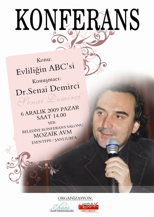 Dr. Senai Demirci “Evliliğin abc’si” konulu konuşması ile Şanlıurfa Mozaik AVM Konferans Salonunda konferans verecek.