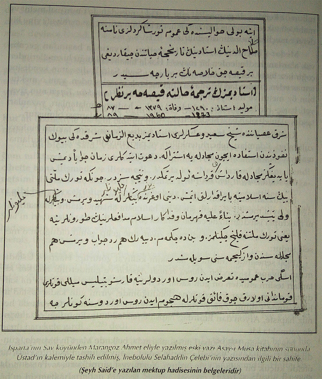 Isparta’nın Sav Köyü’nden Marangoz Ahmet eliyle yazılmış ve ayrıca eski yazı Asâ-yı Mûsâ kitabının sonunda dercedilmiş ve Üstâd’ın da tashih ettiği yazıyor (bu tashih işleminin Allahu a’lem; Üstâd’ın kalem ile değil, söylemesiyle yapılmış olduğunu anlıyoruz. Çünkü notlar hem az, hem de düzgün bir yazıdır). Bu nüshâda ne yazıyor, kaydedelim: