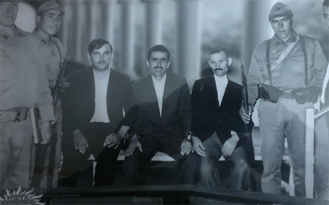 Sene 1971 Çal Mahkemesinin salonu. Ortada Osman Bozkurt iki taraftan kelepçeli, solunda Alâeddin Barış vefat etti, sağında Abdullah Dündar.
