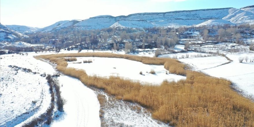 Dondurucu soğukların etkisiyle tamamen donan ve son günlerde yağan karla beyaza bürünen Iğdır'daki Üçkaya Gölü, doğal güzelliğiyle dikkati çekiyor.
