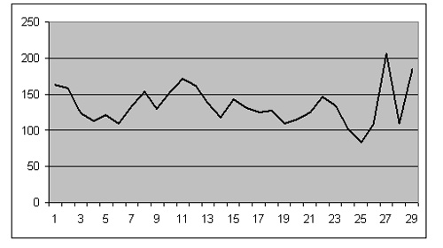 „Hafta sonu daha fazla katılım“ olur düşüncesi de tespit edilemedi. Elimizdeki veriler bunu tasdik etmiyor. Aşağıdaki tabloda her gün için ay boyunca toplam katılımcı sayısını görmekteyiz: