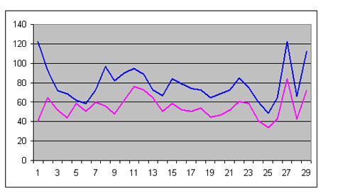 Erkek katılımcılar (mavi çizgi) bayanlara (pembe çizgi) nazaran daha çok. Erkekler ortalama 1,45 kat daha fazla. En büyük fark ilk gün oluşmuş. İlk gün neredeyse üç kat daha fazla erkek namazda bulunmuş. İlginç olan erkeklerin ve kadınların katılım şekli birebir örtüşüyor. Bir kaç günü saymaz isek katılım grafiği neredeyse aynı.