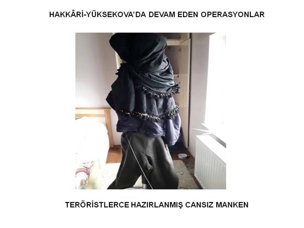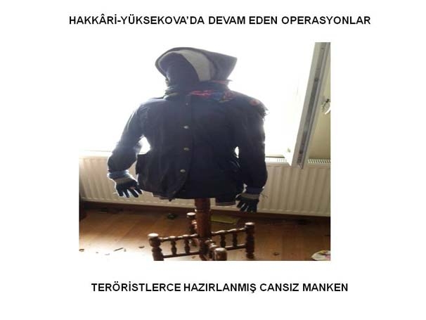 Yüksekova ve Silopi'de teröristlerin hedef yaparak güvenlik güçlerinin yerlerini tespit etmek ve kaçarken güvenlik güçlerini oyalamak amacıyla kullandıkları cansız mankenler ele geçirildi.