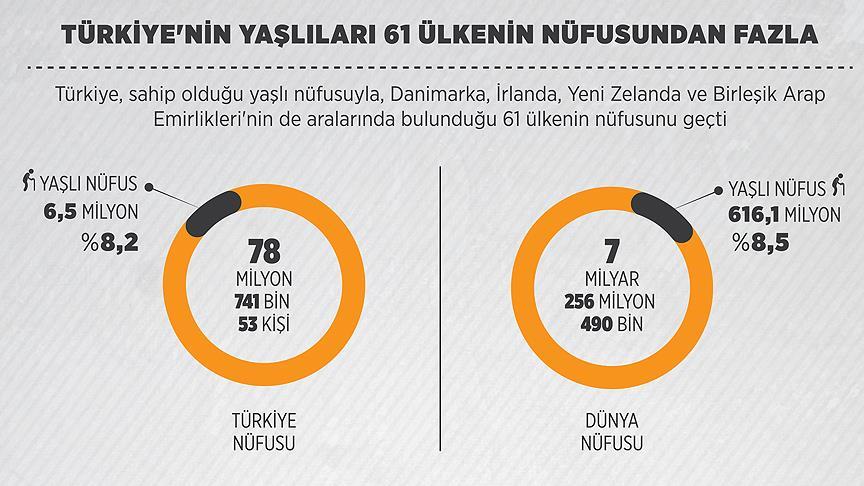 Türkiye, sahip olduğu 6 milyon 495 bin 239 kişilik yaşlı nüfusuyla, Danimarka, İrlanda, Yeni Zelanda ve Birleşik Arap Emirlikleri'nin de aralarında bulunduğu 61 ülkenin nüfusunu geçti.