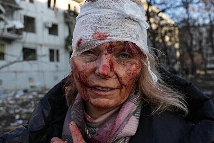 Rusya'nın son Ukrayna saldırısında yaşlı, yaralı bir kadın.