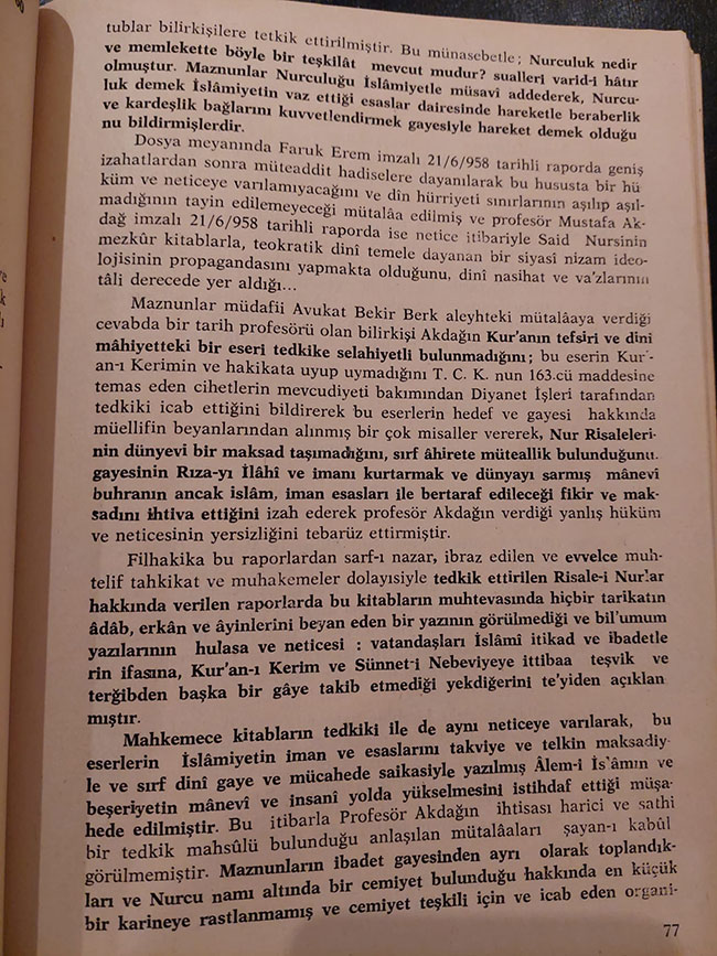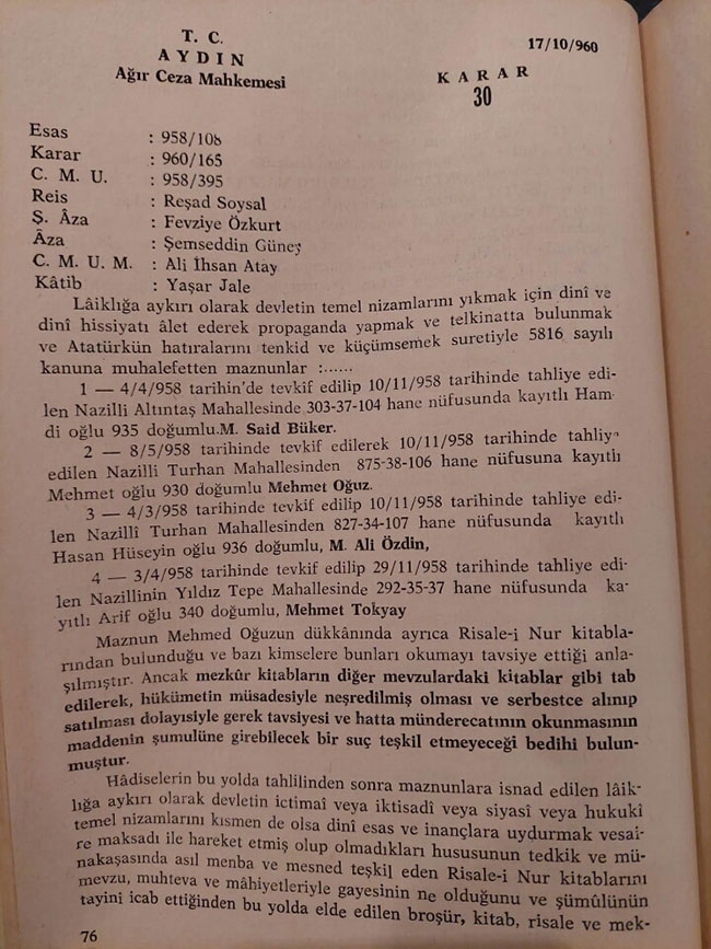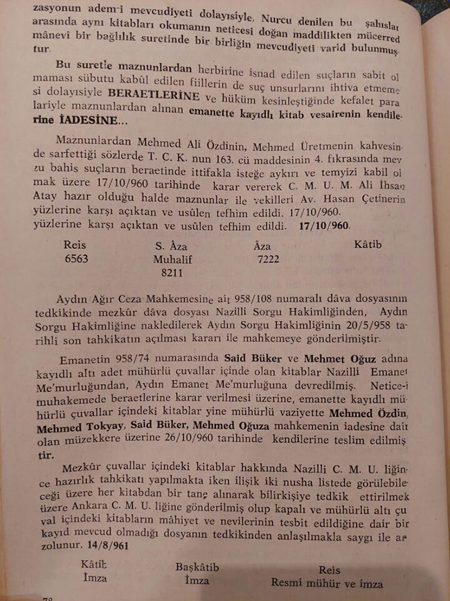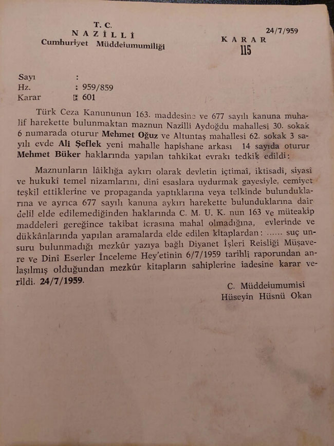[Diyanet İşleri Müşavere Heyeti ve İnceleme Heyeti'nin, 6.7.1959 tarihli raporundan suçsuzluğu anlaşılmış olup, mezkur kitapların sahiplerine iadesine karar verildi. 24 Temmuz 1959]