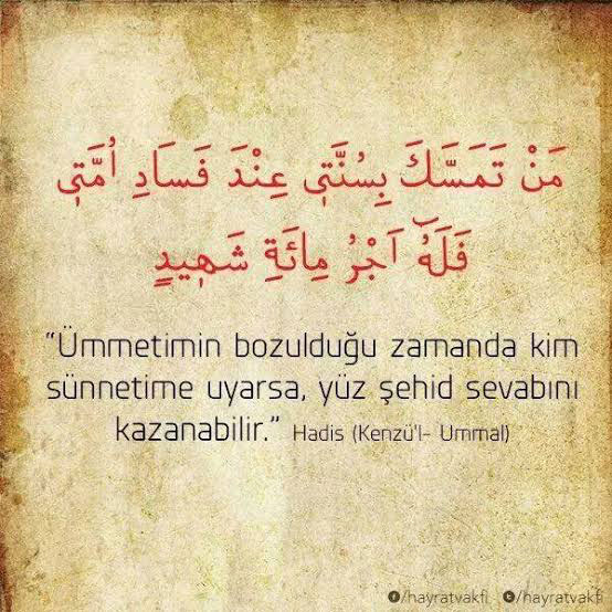 “Ümmetimin fesada gittiği zamanda kim benim sünnetime sarılsa ona yüz şehit sevabı vardır.” (İbni Adiy, el-Kâmil fi’d-Duafâ, 2:739; el-Münzirî, et-Terğîb ve’t-Terhîb, 1:41; Taberânî, el-Mecmeu’l-Kebîr, 1394; el-Heysemî, Mecmeu’z-Zevâid, 7:282.)