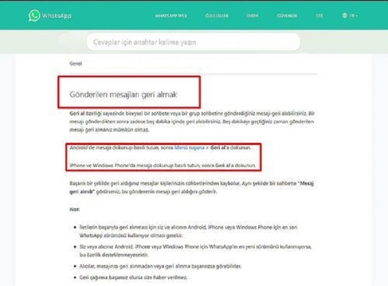 Yukarıdaki ekran görüntüsünde de gözüktüğü üzere, açıklama WhatsApp tarafından yapıldı. Fakat içerik yanlışlıkla yayına alınmış olacak ki kısa bir süre sonra siteden kaldırıldı. WhatsApp’ın sitesinde göründüğü üzere, gönderilen bir mesaj, 5 dakika içinde geri alınabiliyor. Bu süre geçtikten sonra ise mesaj geri alınamıyor. Söz konusu mesaj geri alındıktan sonra ise ‘mesaj geri alındı’ ibaresi yer alıyor.
