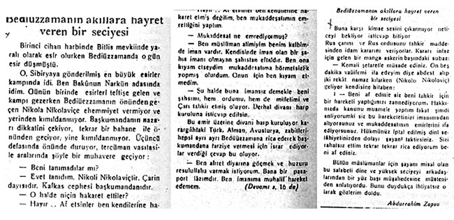 “Bediüzzaman’ı üsera kampına götürürler. Burada şu şekilde şayan-ı takdir bir hadise cereyan eder. Şöyle ki: Bir gün Rus Başkumandanı esirleri teftişe gelir. Teftiş esnasında Bediüzzaman kumandana selam vermez ve yerinden kalkmaz; kumandan kızar. "Belki tanımamıştır" diyerek tekrar önünden geçtiği zaman yine yerinden kalkmayınca, kumandan, tercüman vasıtasıyla der: