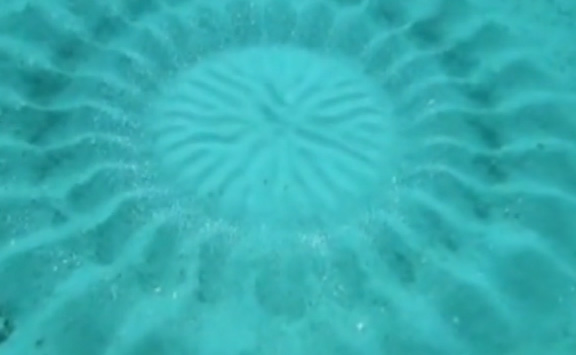 Rivayete göre 20 yıl kadar önce Japon sualtı bilimcileri deniz dibinde yaklaşık 2 metre çapında kuma çizilen bir resmi görmüşler, hiçbir şekilde açıklayamayınca bu işin ancak uzaylılar tarafından yapılabileceği tahmini ile olayı kapatmışlar. Medyaya düşen yeni video görüntüsünde şekillerin esrarı çözülmüş, sanatkar balık resmi çizerken tablo üzerinde görüntülenmiş!