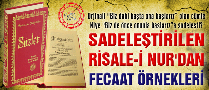 6-1. Sözdeki fecaatlar dışında mesela 7. sözde Talimgah kelimesi eğitim; mücahede kelimesi hizmet olarak tahrif edilmiştir. Hizmet başka bir şey, mücahede başka bir şey. Hem anlam daralması yapılmış, hem de hizmet kelimesiyle belli bir cemaatin hizmet faaliyetleri anlaşılsın diye anlamda hasr‘a gidilmiştir. Böyle tasarruflar yaparak terimlerle oynamak metne suikasttır.