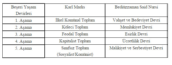 Marks ve Bediüzzaman’ın beşeriyet devirlerini bir tablo ile karşılaştıracak olursak, son aşamada farklılık göze çarpmakta ve Bediüzzaman’ın bu son devrede ‘malikiyet ve serbestliği’ öngördüğü ortaya çıkmaktadır.